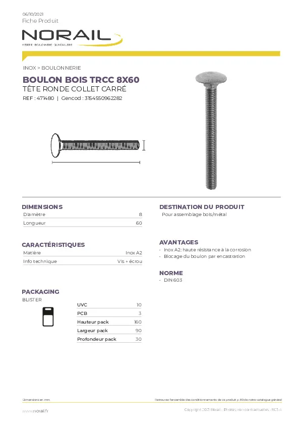 BOULON BOIS TÊTE RONDE COLLET CARRE MATIERE INOX A2 TAILLE 8X60 CONDITIONNEMENT BLISTER DE 10 PIECES