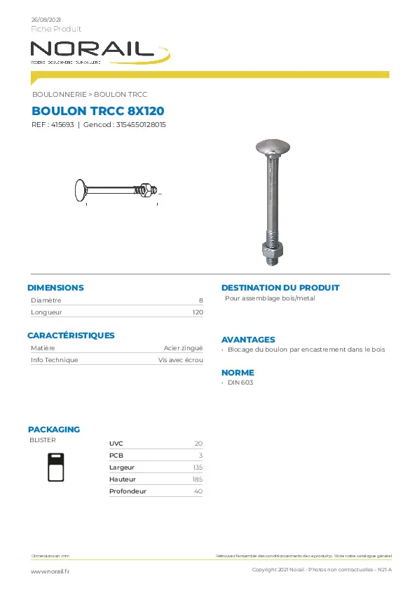BOULON BOIS TÊTE RONDE COLLET CARRE CLASSE 4.8 EN ACIER ZINGUE TAILLE 8X120 CONDITIONNEMENT BLISTER DE 20 PIECES