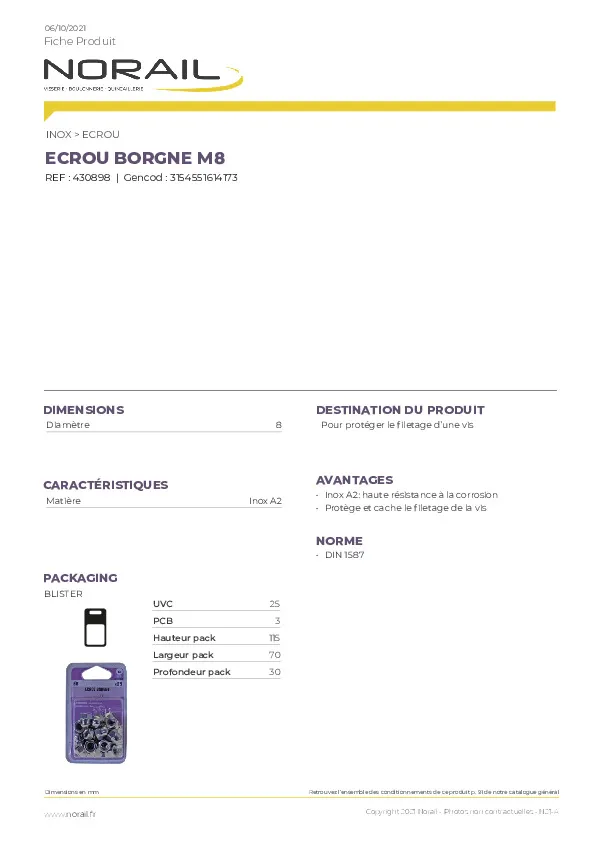 ECROU BORGNE MATIERE INOX A2 DIAMETRE 8 CONDITIONNEMENT BLISTER DE 25 PIECES