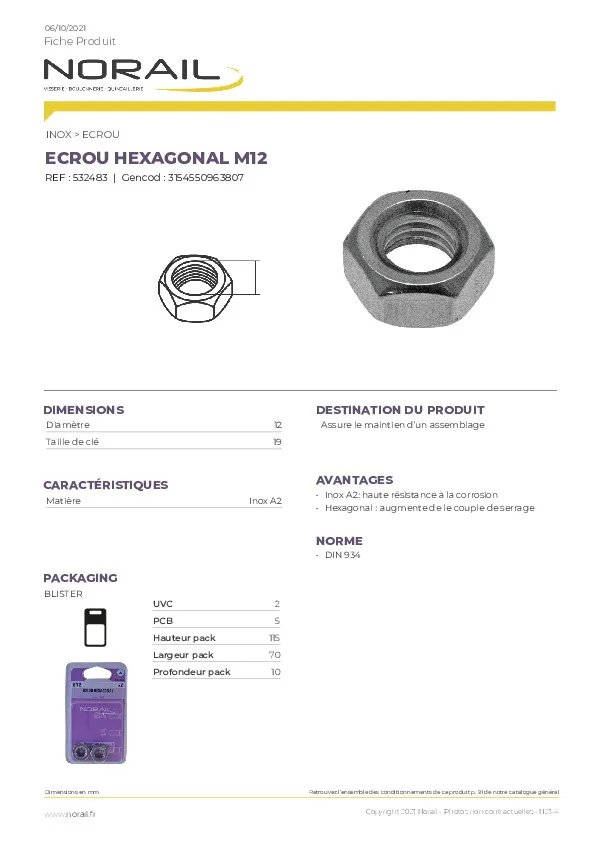 ECROU HEXAGONAL MATIERE INOX A2 DIAMETRE 12 CONDITIONNEMENT BLISTER DE 2 PIECES