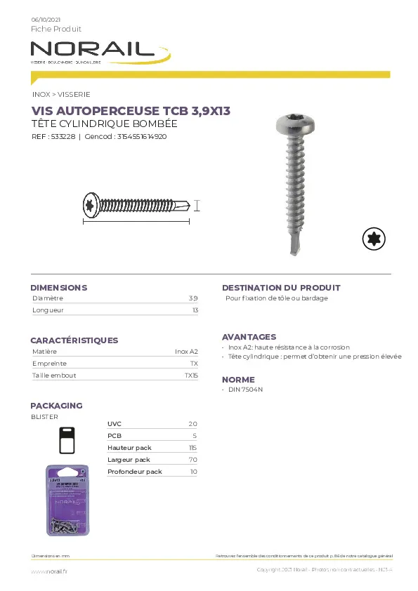 VIS AUTOPERCEUSE TÊTE CYLINDRIQUE EMPREINTE TORX MATIERE INOX A2 TAILLE 3,9X13 CONDITIONNEMENT BLISTER DE 20 PIECES
