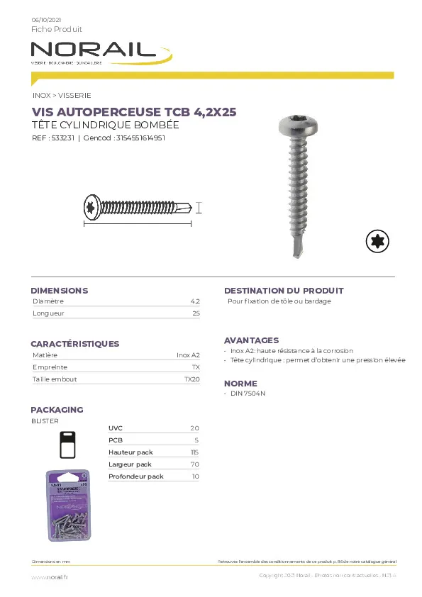 VIS AUTOPERCEUSE TÊTE CYLINDRIQUE EMPREINTE TORX MATIERE INOX A2 TAILLE 4,2X25 CONDITIONNEMENT BLISTER DE 20 PIECES