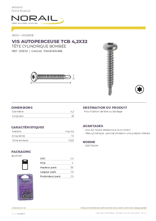 VIS AUTOPERCEUSE TÊTE CYLINDRIQUE EMPREINTE TORX MATIERE INOX A2 TAILLE 4,2X32 CONDITIONNEMENT BLISTER DE 20 PIECES