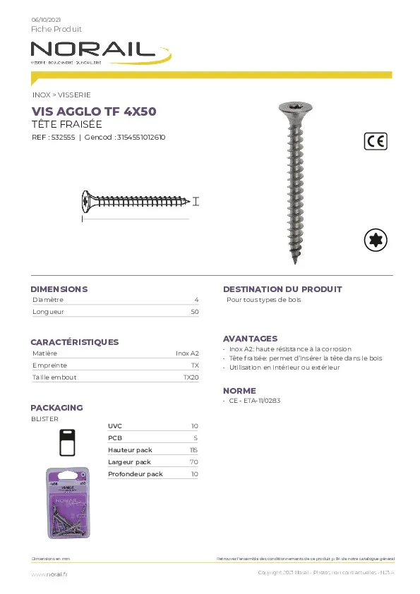 VIS AGGLO TÊTE FRAISEE EMPREINTE TORX MATIERE INOX A2 TAILLE 4X50 CONDITIONNEMENT BLISTER DE 10 PIECES