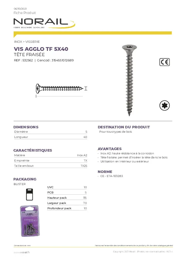 VIS AGGLO TÊTE FRAISEE EMPREINTE TORX MATIERE INOX A2 TAILLE 5X40 CONDITIONNEMENT BLISTER DE 10 PIECES