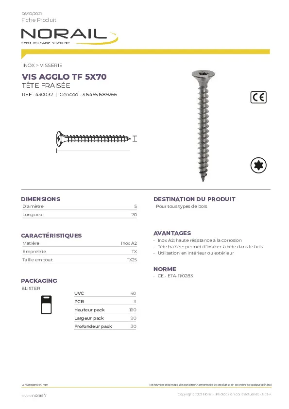 VIS AGGLO TÊTE FRAISEE EMPREINTE TORX MATIERE INOX A2 TAILLE 5X70 CONDITIONNEMENT BLISTER DE 40 PIECES