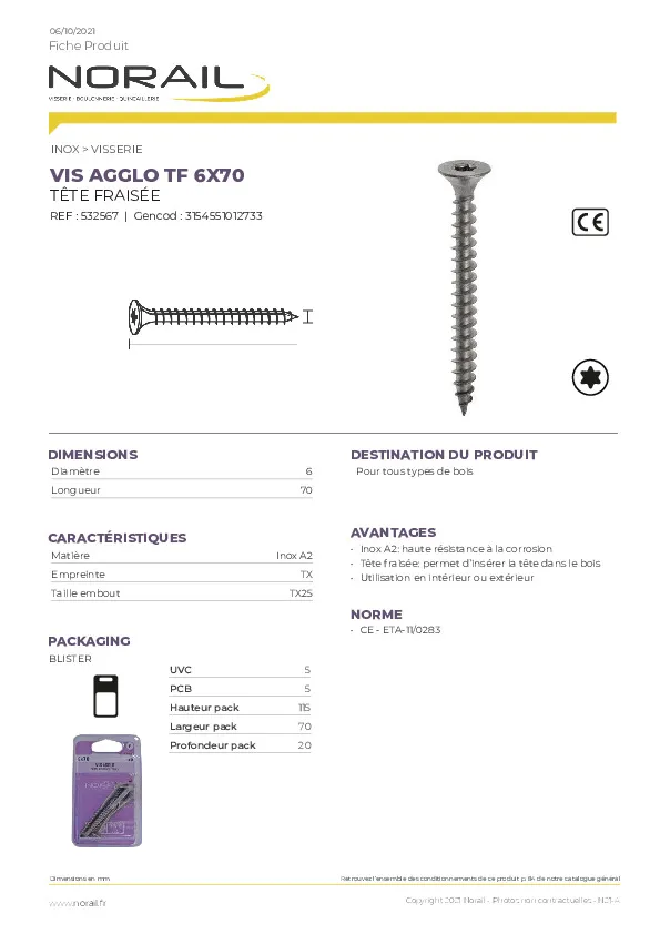 VIS AGGLO TÊTE FRAISEE EMPREINTE TORX MATIERE INOX A2 TAILLE 6X70 CONDITIONNEMENT BLISTER DE 5 PIECES
