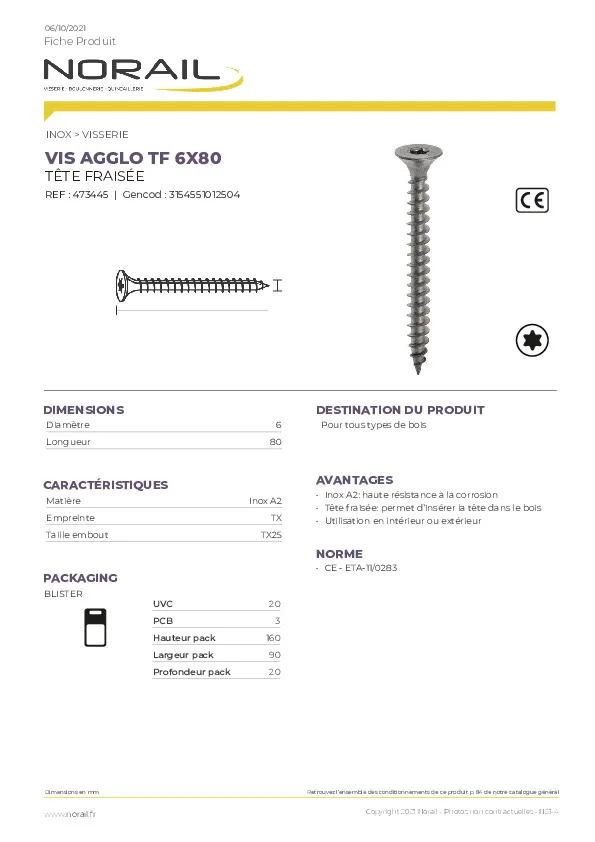 VIS AGGLO TÊTE FRAISEE EMPREINTE TORX MATIERE INOX A2 TAILLE 6X80 CONDITIONNEMENT BLISTER DE 20 PIECES