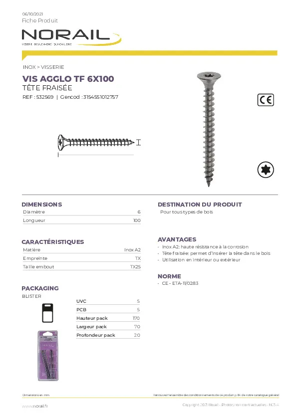 VIS AGGLO TÊTE FRAISEE EMPREINTE TORX MATIERE INOX A2 TAILLE 6X100 CONDITIONNEMENT BLISTER DE 5 PIECES