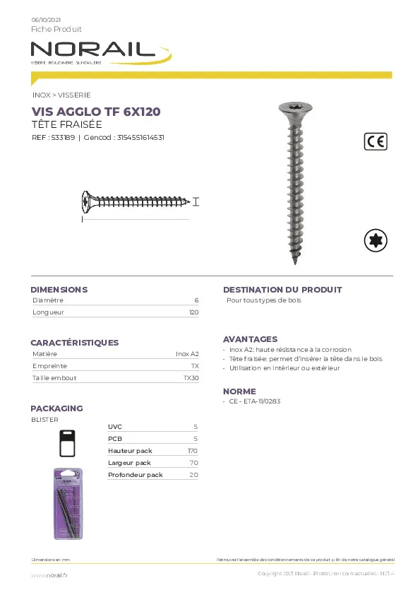 VIS AGGLO TÊTE FRAISEE EMPREINTE TORX MATIERE INOX A2 TAILLE 6X120 CONDITIONNEMENT BLISTER DE 5 PIECES