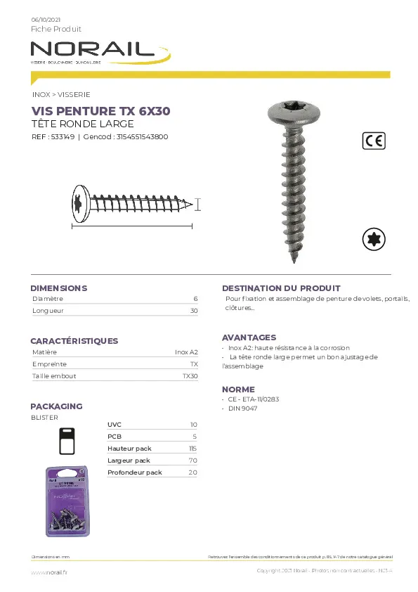 VIS PENTURE TÊTE RONDE EMPREINTE TORX MATIERE INOX A2 TAILLE 6X30 CONDITIONNEMENT BLISTER DE 10 PIECES