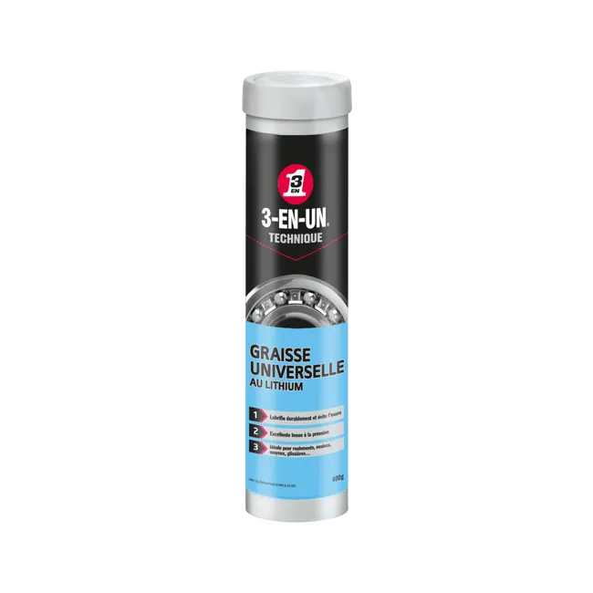 La Graisse Universelle au Lithium 3-EN-UN® TECHNIQUE assure une lubrification longue durée de tous les mécanismes qui roulent, tournent, glissent ou s’emboîtent. Résistante à l’eau et à la pression, adaptée aux conditions extérieures, elle réduit les frottements tout en protégeant de la rouille et de la corrosion. Elle est indiquée pour les moyeux, paliers, galets, engrenages, charnières de portail, etc.