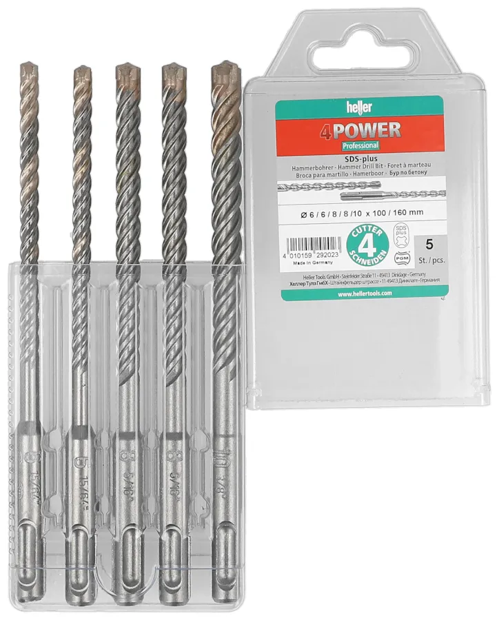 - Le 4Power Pro est le meilleur 4 taillants premium foret marteau de Heller. Les 4 tranchants et les 4 hélices assurent une progression de perçage puissante et rapide dans le béton et l'armature. Ce faisant, la technologie innovante des 4 hélices permet d'évacuer efficacement la poussière de perçage avec une déflagration minimale de la poussière. Le foret SDS Plus 4 taillants 4Power Pro de Heller se distingue particulièrement par sa résistance et fait preuve d'une durée de vie accrue aussi bien dans le béton que dans l'armature. Grâce à la géométrie optimisée de la tête ou du carbure, le 4Power Pro perce 10% plus vite dans le béton, est 3x plus robuste dans l'armature et a une durée de vie 2x plus longue par rapport à son prédécesseur. La nouvelle pointe de centrage double brevetée en carbure de tungstène assure en outre une amorce de forage plus stable et plus précise, rendant ainsi le forage aussi convivial que possible.