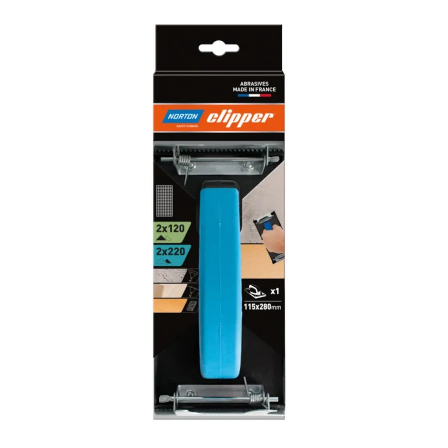 Kit de ponçage pour plâtre et mastic. Une cale avec poignées. 4 recharges : 2 grain 120 + 2 grain 220.