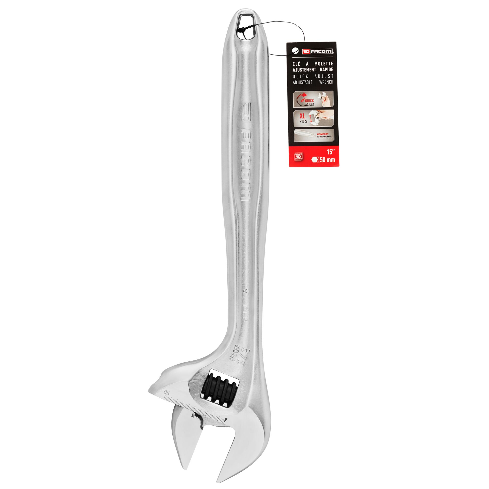 Clé à molette à ajustement rapide du mors mobile sur l’écrou - longueur 15 - ouverture maximale 50 mm - tête inclinée à 22° - une face graduée en mm - manche métal, corps chromé brillant - FACOM 101.15PB