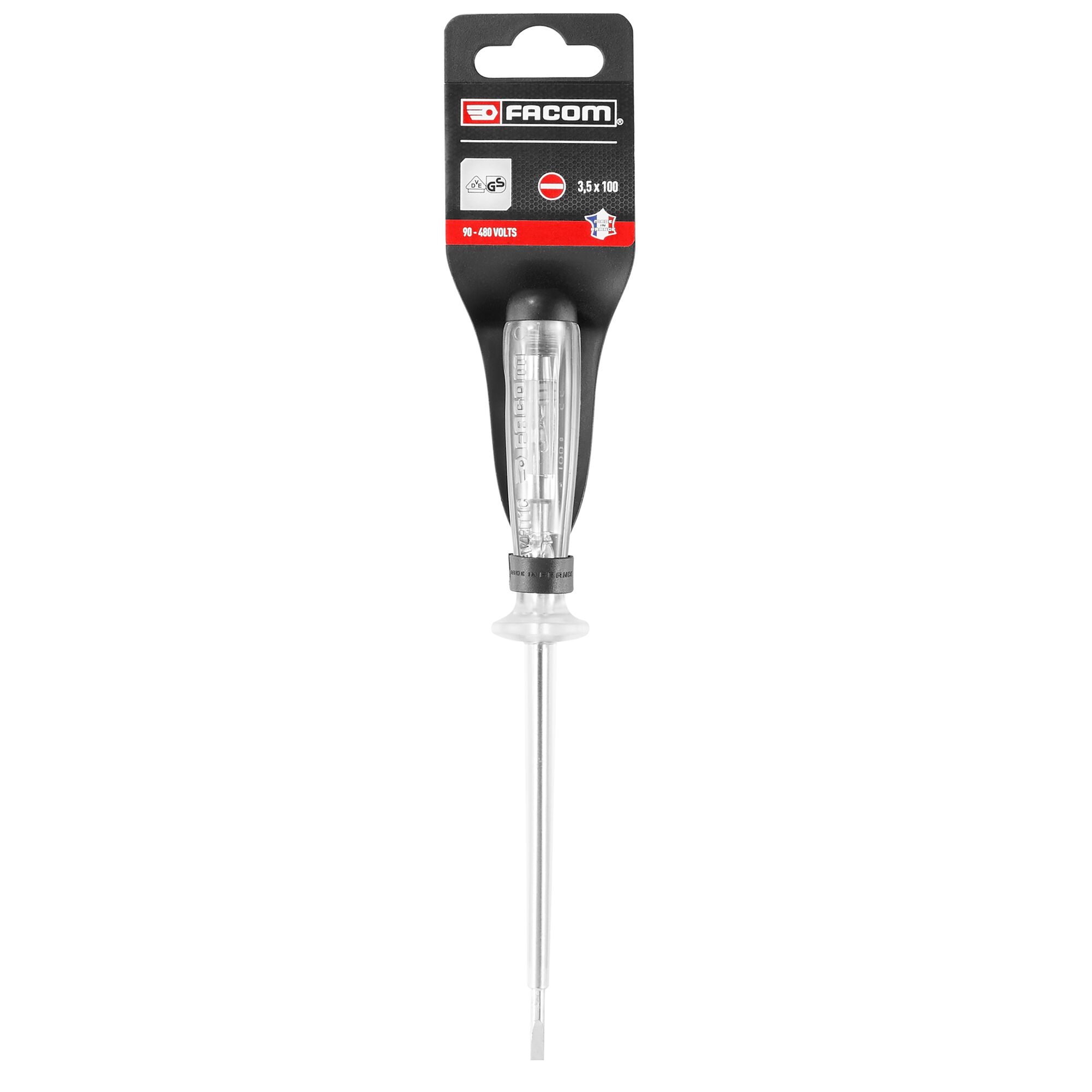 - Garde de sécurité largeur : 5 mm. - Témoin lumineux. - Manche transparent. - Lame en acier vanadium chromé. - Extrémité lame en phosphate noir durci. - Homologué VDE-GS.