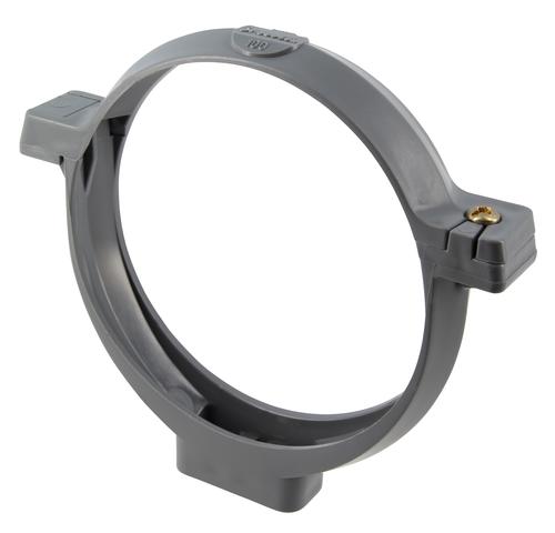 Collier à bride en polypropylène gris, ø 100 mm, embase avec insert au pas de 7x150, permet de clipser immédiatement le tube, permet la libre dilatation des canalisations
