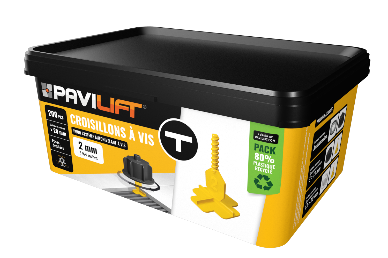 - Le croisillon autonivelant 2 millimètres en T s’utilise pour tous types de poses. Il est résistant au serrage et conçu pour casser parfaitement à la base. Après la casse, il n’y a plus qu’à réaliser les joints.
