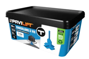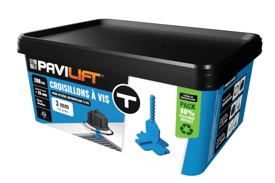 - Le croisillon autonivelant 3 millimètres en T s’utilise pour les poses décalées. Il est résistant au serrage et conçu pour casser parfaitement à la base. Après la casse, il n’y a plus qu’à réaliser les joints.